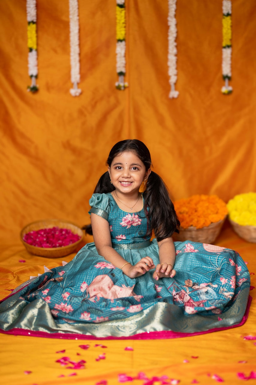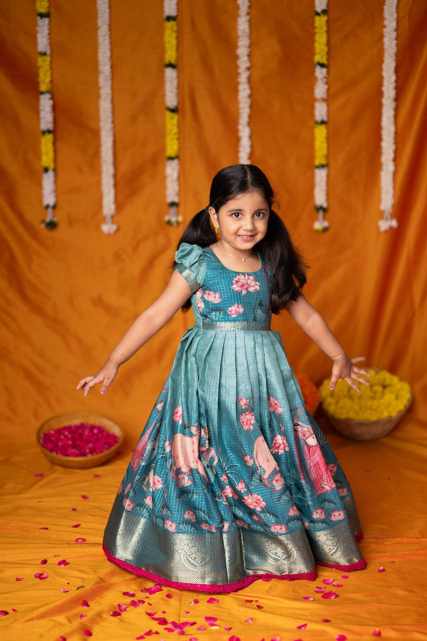 The Nikazhya Frock Mini is a charming blend of tradition and festivity, designed especially for little girls. Crafted in Pichwai print dola silk, the gown radiates elegance with its vibrant floral prints and zari-woven hemline. The puff sleeves and round neckline add a playful yet refined touch, while the flared pleats give it a flowy silhouette perfect for twirling at weddings, temple visits, and festive celebrations.