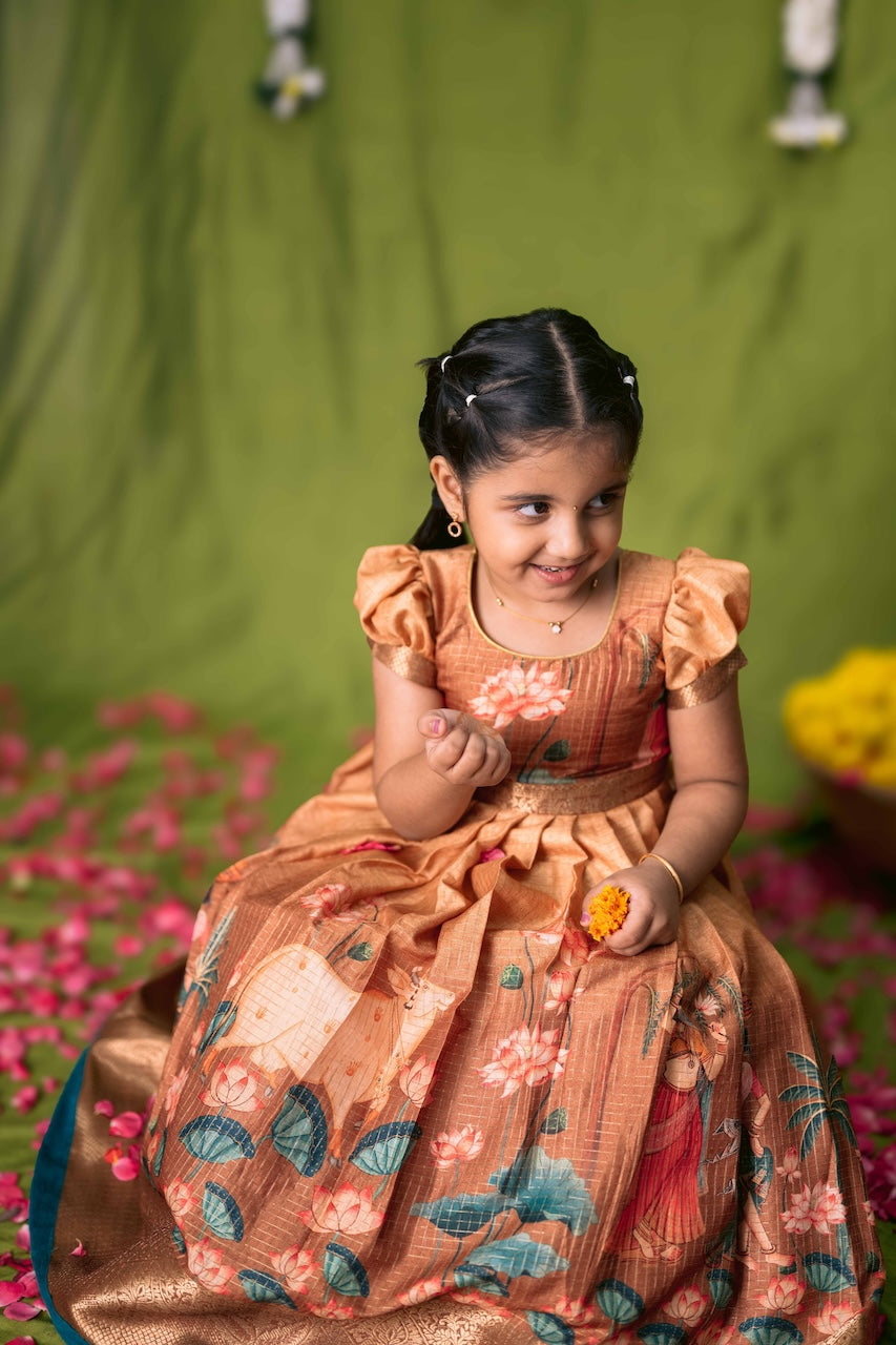 The Nikazhya Yellow Frock Mini is a radiant festive frock crafted from Pichwai print dola silk with zari checks & banarasi border, adorned with delicate floral motifs and a zari woven finishing. Its puff sleeves and pleated flare add a traditional yet playful charm, making it the perfect outfit for weddings, temple visits, and cultural events. With breathable cotton lining and a twirl-ready silhouette, this frock ensures comfort while keeping your little one festive-ready.