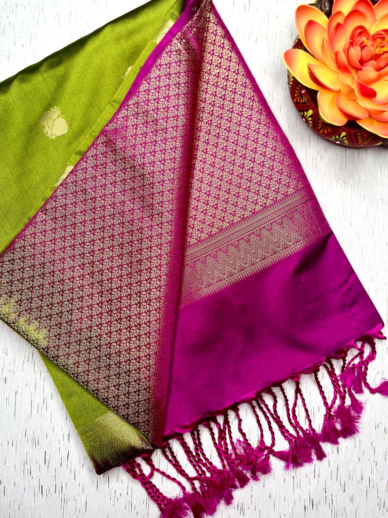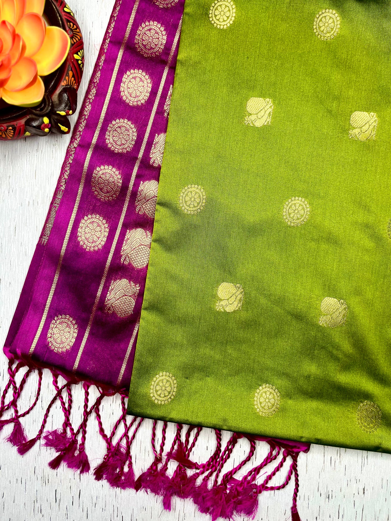 Drape yourself in elegance with this exquisite Kanchi Soft Silk Saree in a stunning barf green color, featuring delicate butta patterns all over the body. The graceful contrast zari pallu adds a touch of grandeur, perfectly paired with a contrasting plum velvet color blouse. A timeless piece that blends tradition with sophistication, perfect for festive and special occasions.