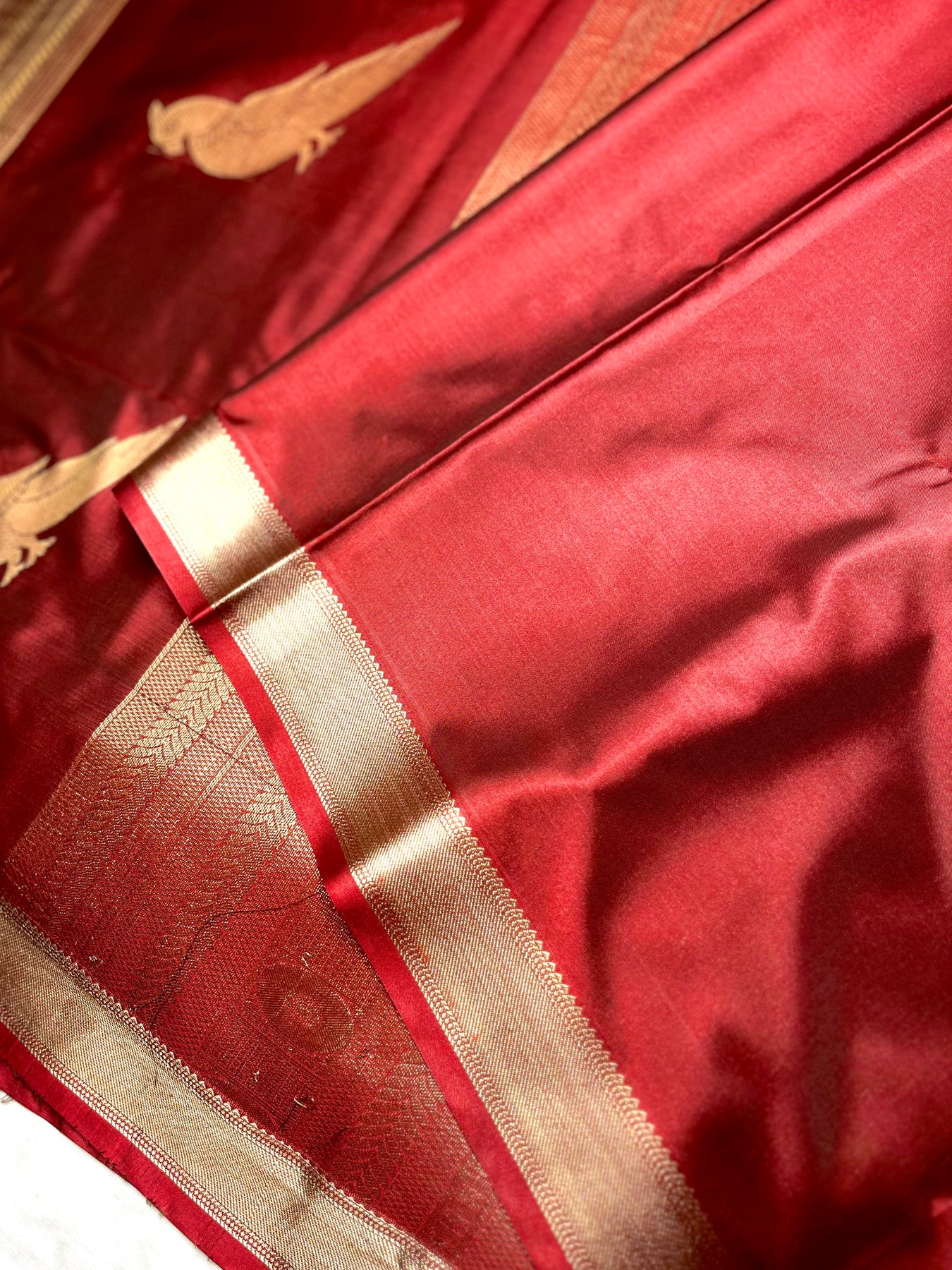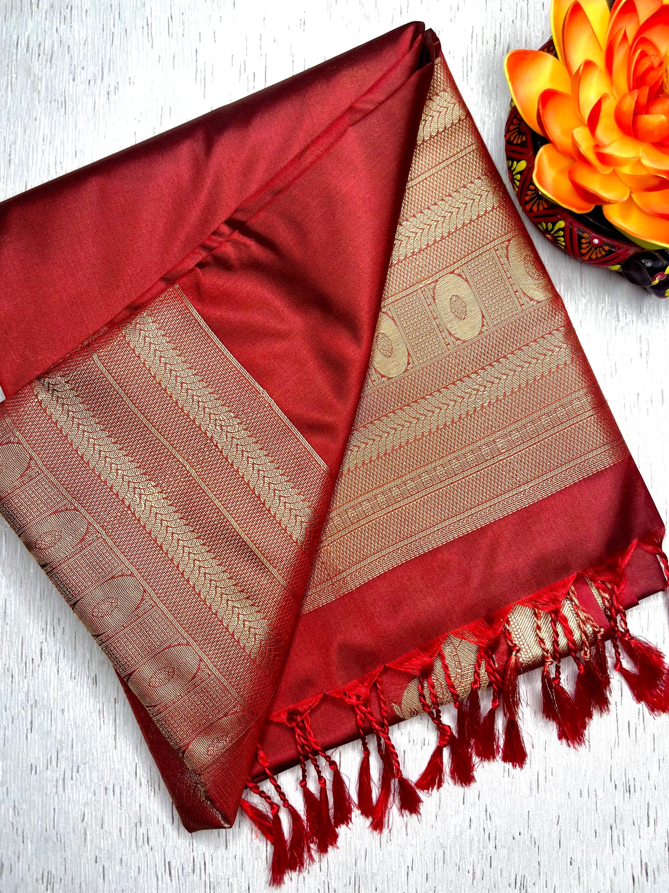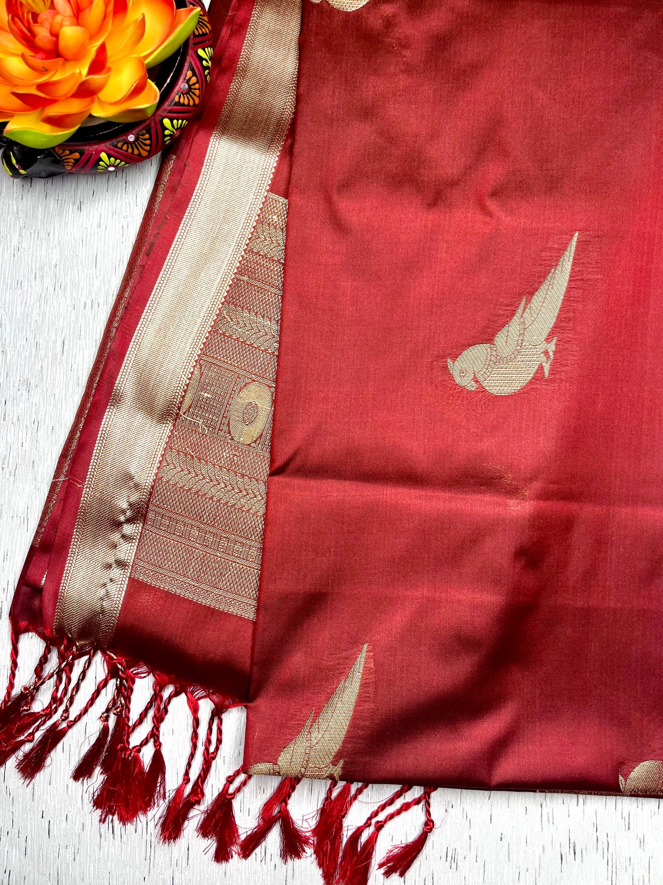 Drape yourself in elegance with this exquisite Kanchi Soft Silk Saree in a stunning burnt red color, featuring delicate parrot patterns all over the body. The graceful zari pallu adds a touch of grandeur, perfectly paired with a matching burnt red color blouse. A timeless piece that blends tradition with sophistication, perfect for festive and special occasions.