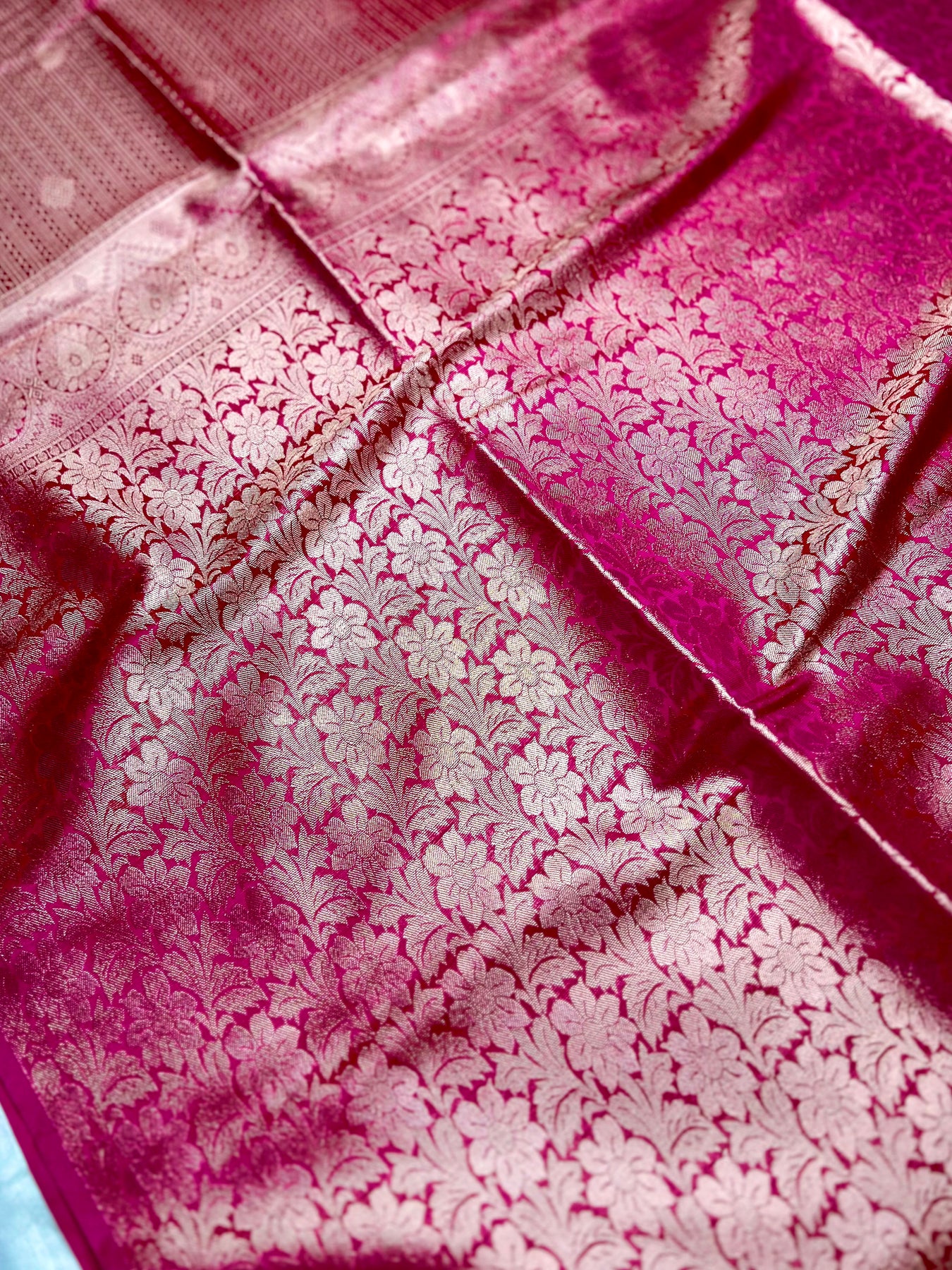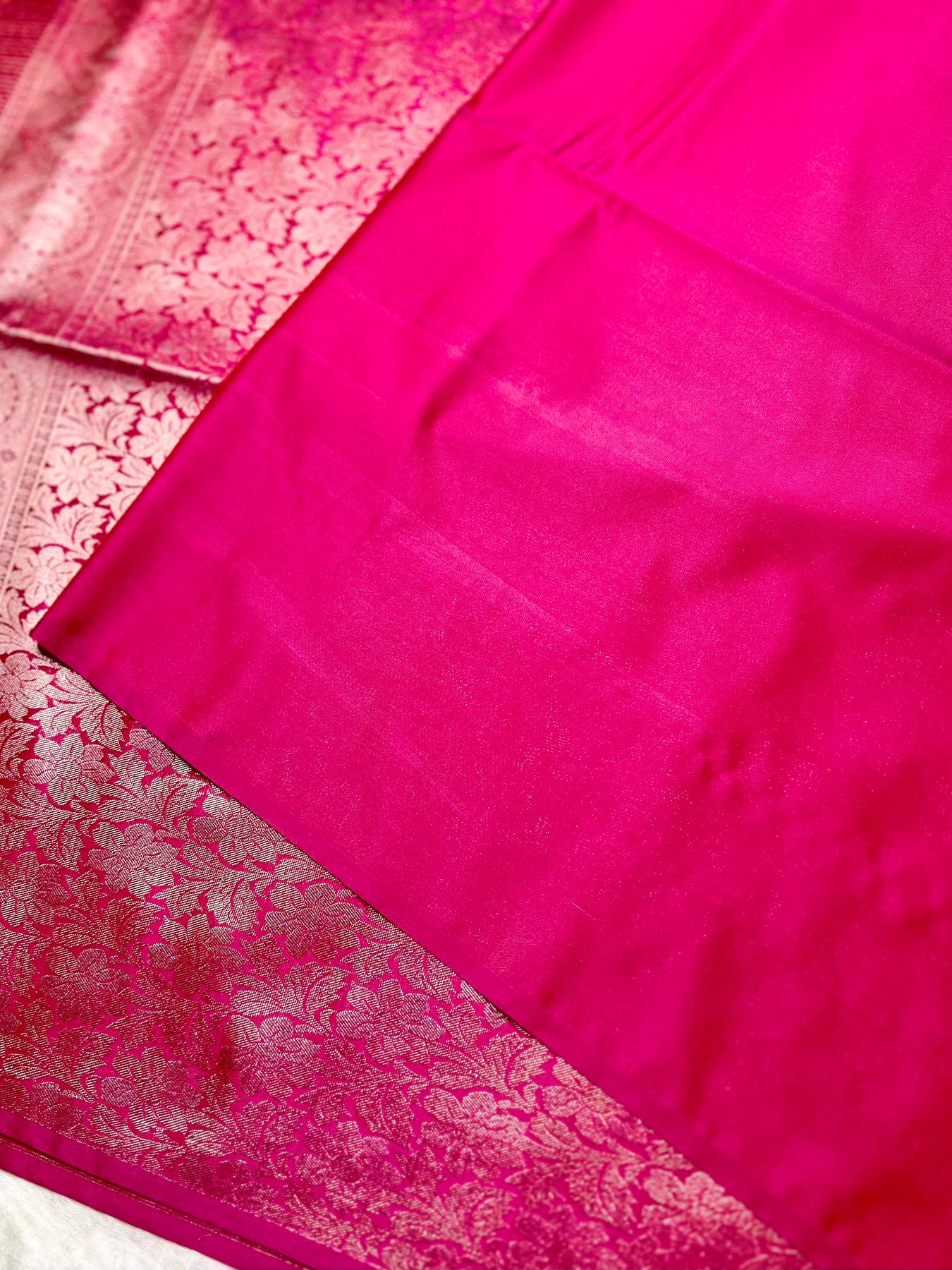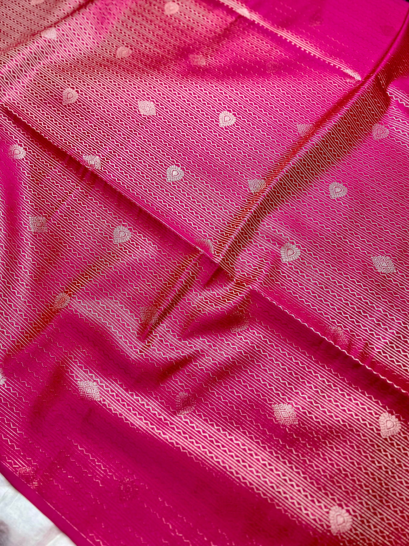 Drape yourself in elegance with this exquisite Kanchi Soft Silk Saree in a stunning cerise pink color, featuring delicate butta patterns all over the body. The graceful zari pallu adds a touch of grandeur, perfectly paired with a matching cerise pink color blouse. A timeless piece that blends tradition with sophistication, perfect for festive and special occasions.