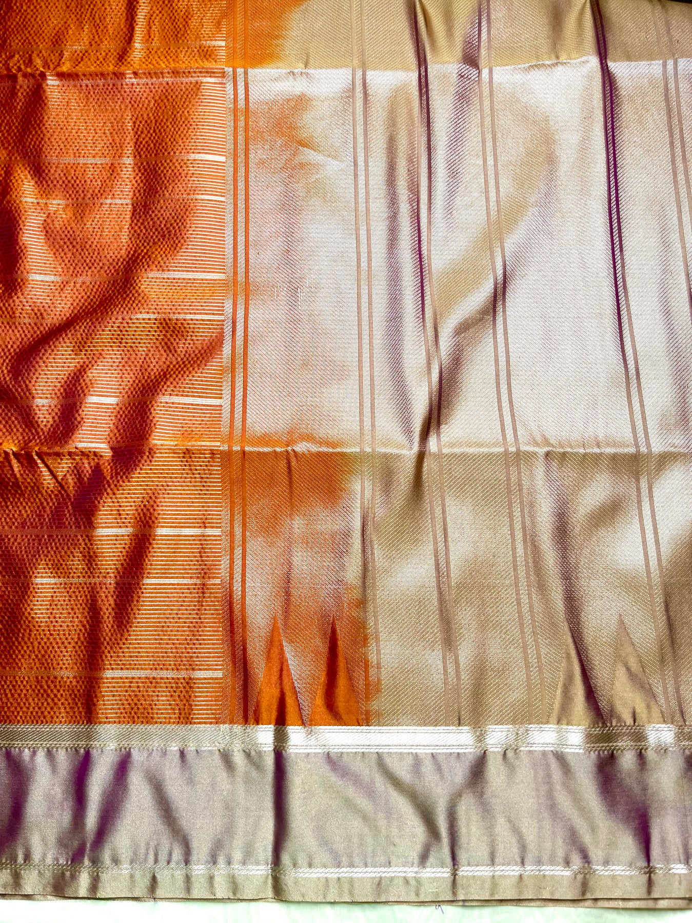 Drape yourself in elegance with this exquisite Kanchi Soft Silk Saree in a stunning fiery orange color, featuring delicate stripe pattern all over the body. The graceful contrast zari pallu adds a touch of grandeur, perfectly paired with a contrasting sandrift color blouse. A timeless piece that blends tradition with sophistication, perfect for festive and special occasions.