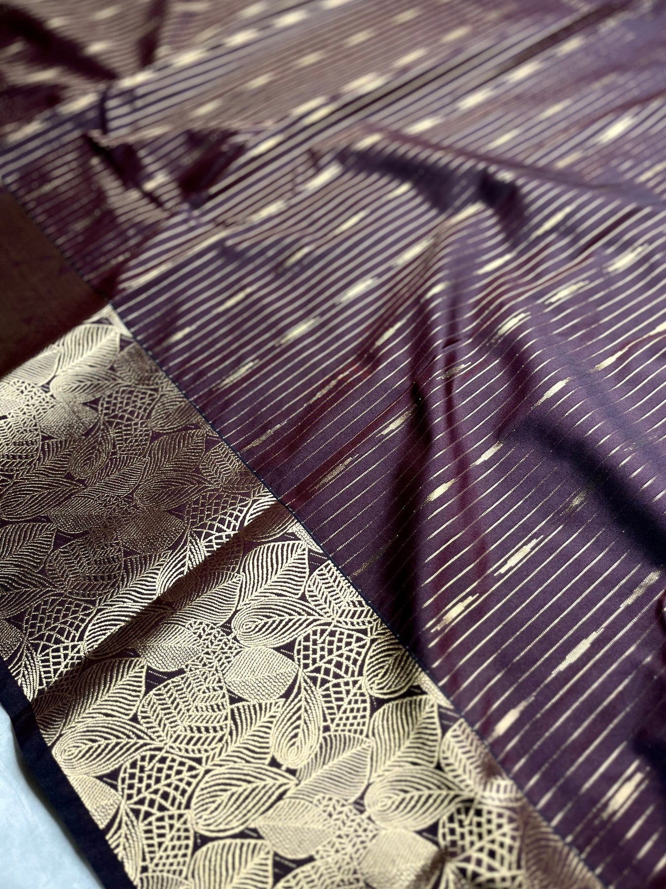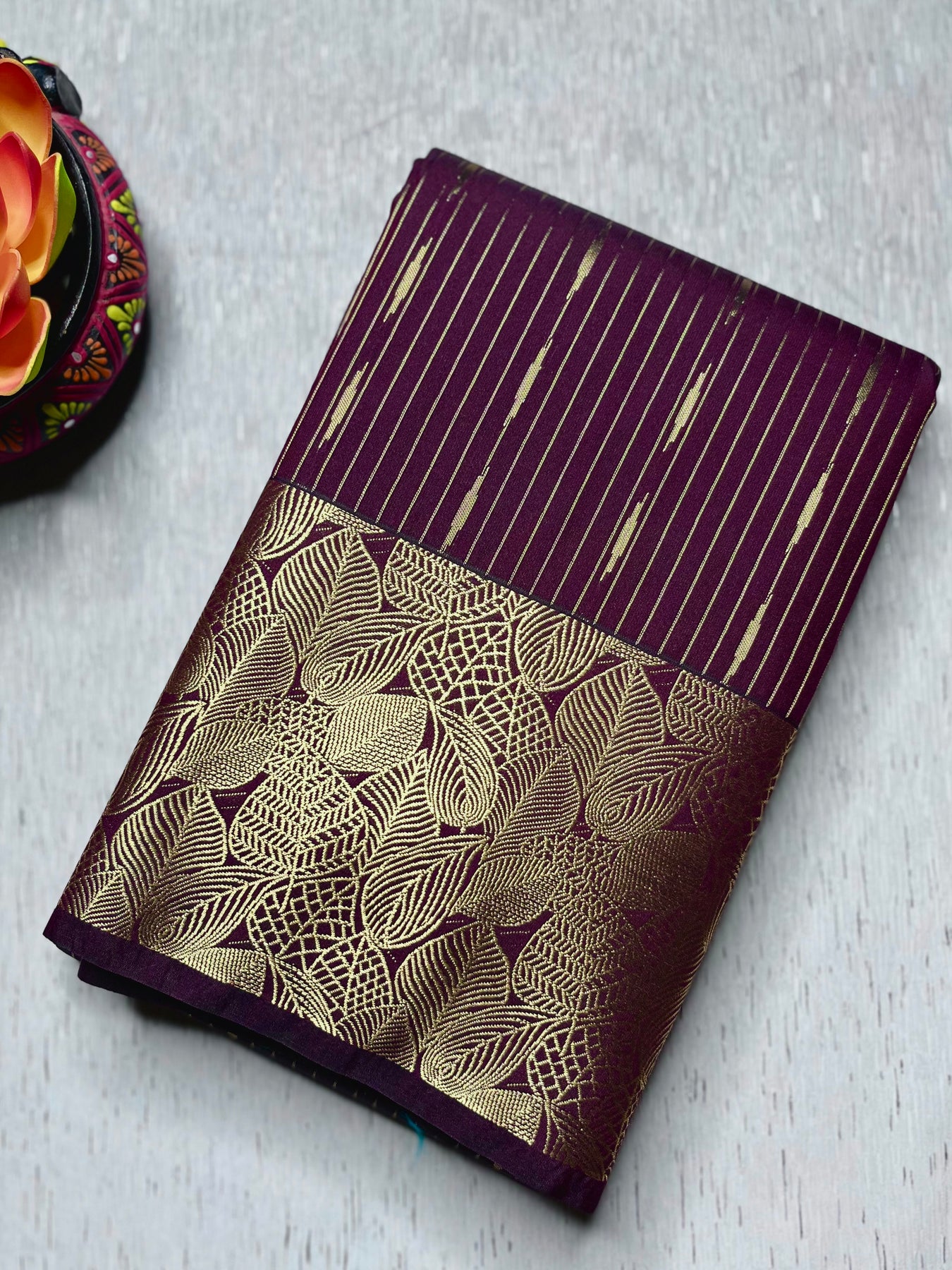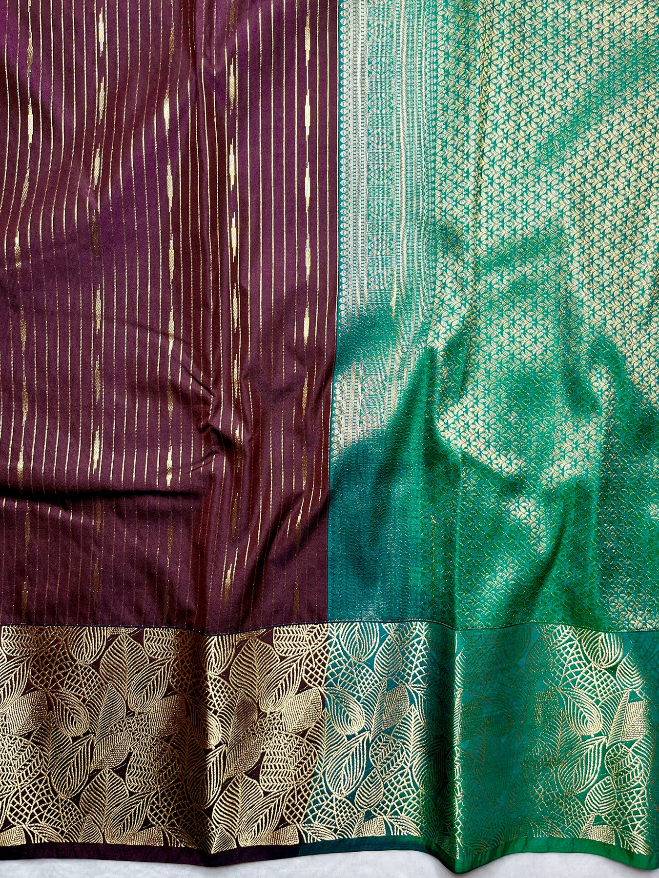 Drape yourself in elegance with this exquisite Kanchi Soft Silk Saree in a stunning livid brown color, featuring delicate stripe patterns all over the body with a grand zari border.. The graceful contrast zari pallu adds a touch of grandeur, perfectly paired with a contrastng caribbean green color blouse. A timeless piece that blends tradition with sophistication, perfect for festive and special occasions.