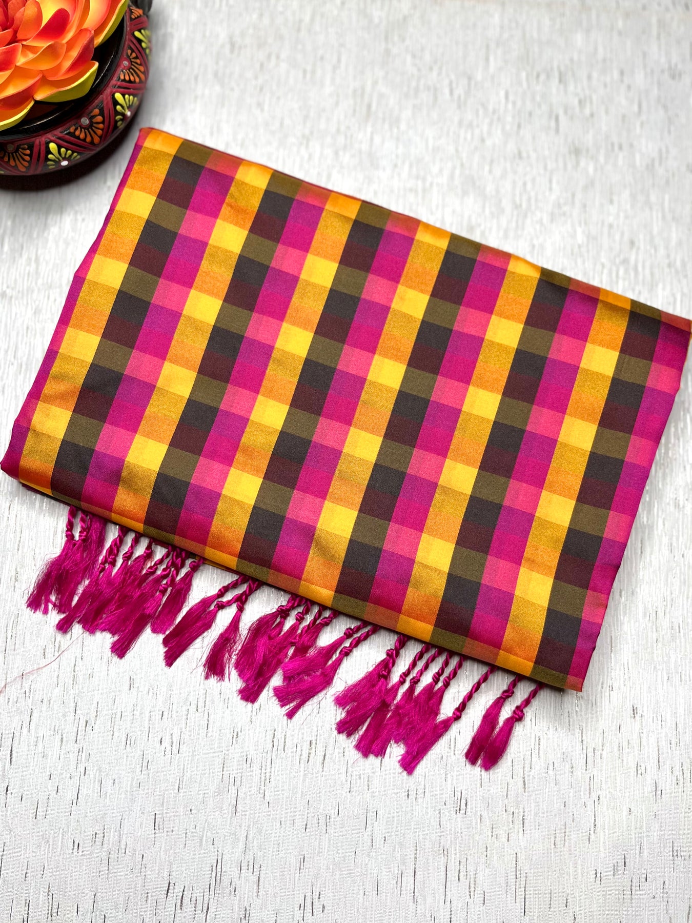 Drape yourself in elegance with this exquisite Kanchi Soft Silk Saree in a stunning multicolor mini checks, featuring delicate checks pattern all over the body. The graceful contrast zari pallu adds a touch of grandeur, perfectly paired with a contrasting persian pink color blouse. A timeless piece that blends tradition with sophistication, perfect for festive and special occasions.