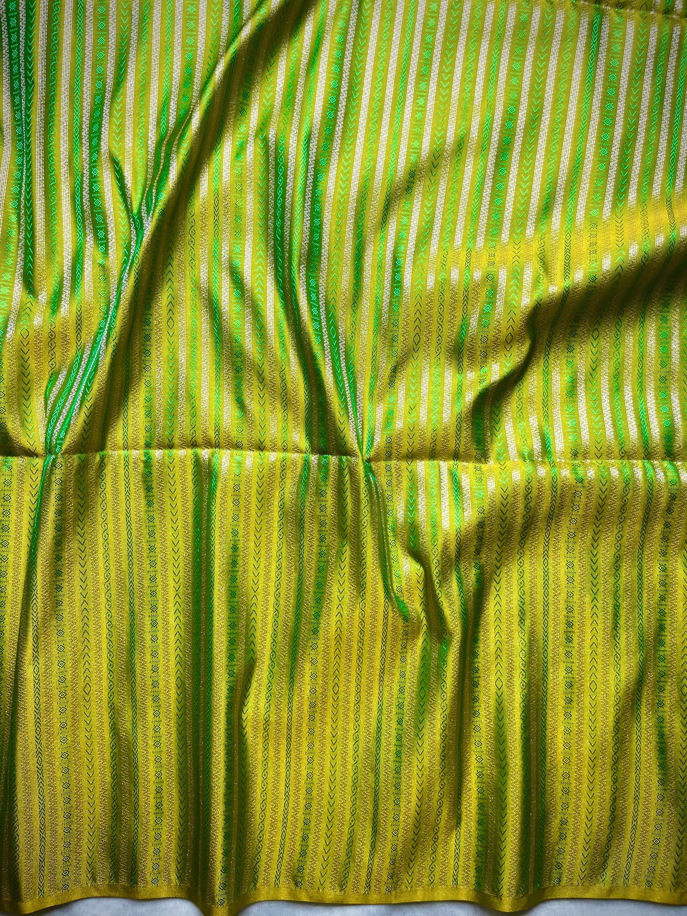 Drape yourself in elegance with this exquisite Kanchi Soft Silk Saree in a stunning livid brown color, featuring delicate stripe patterns all over the body with a grand zari border.. The graceful contrast zari pallu adds a touch of grandeur, perfectly paired with a contrastng  caribbean green color blouse. A timeless piece that blends tradition with sophistication, perfect for festive and special occasions.