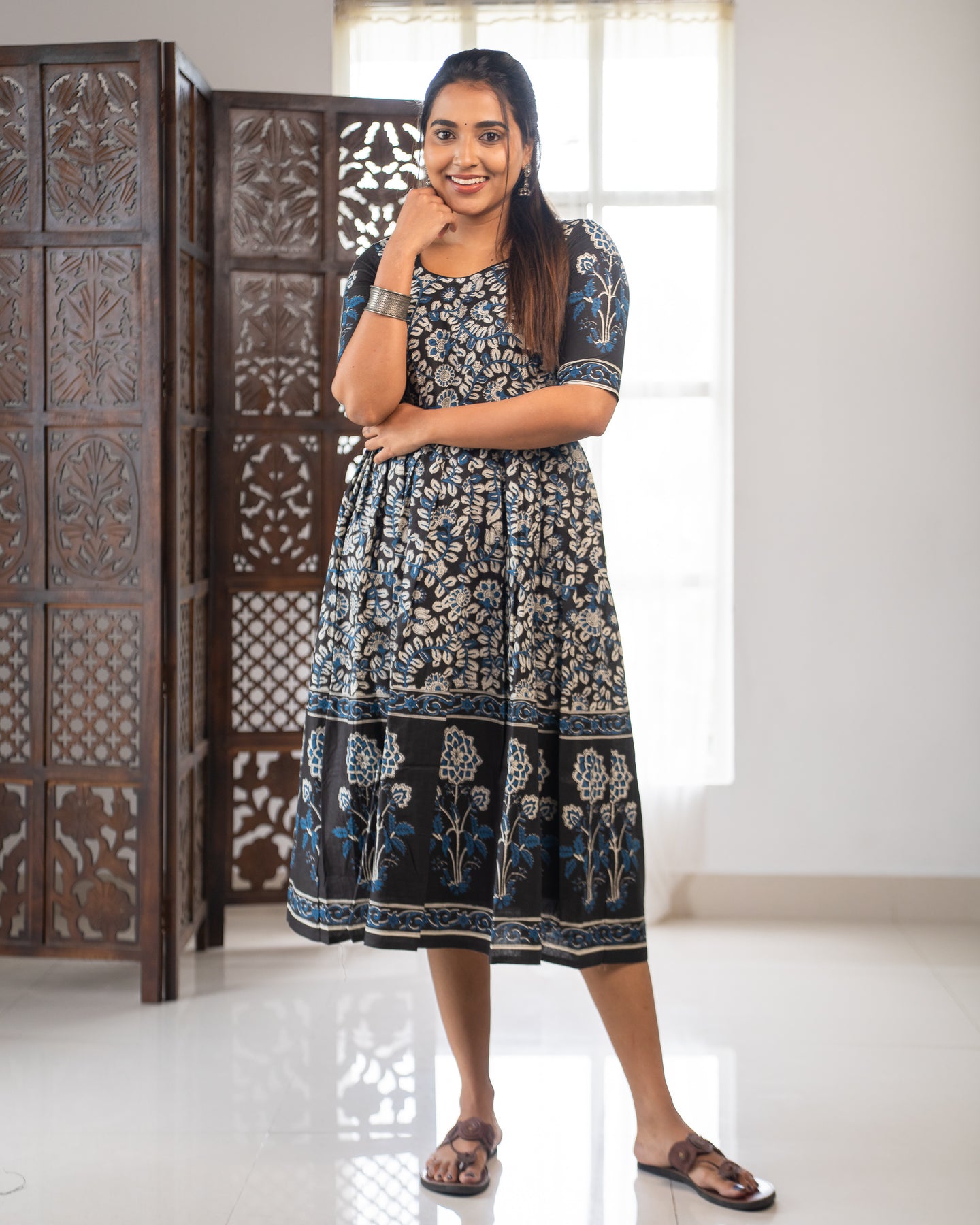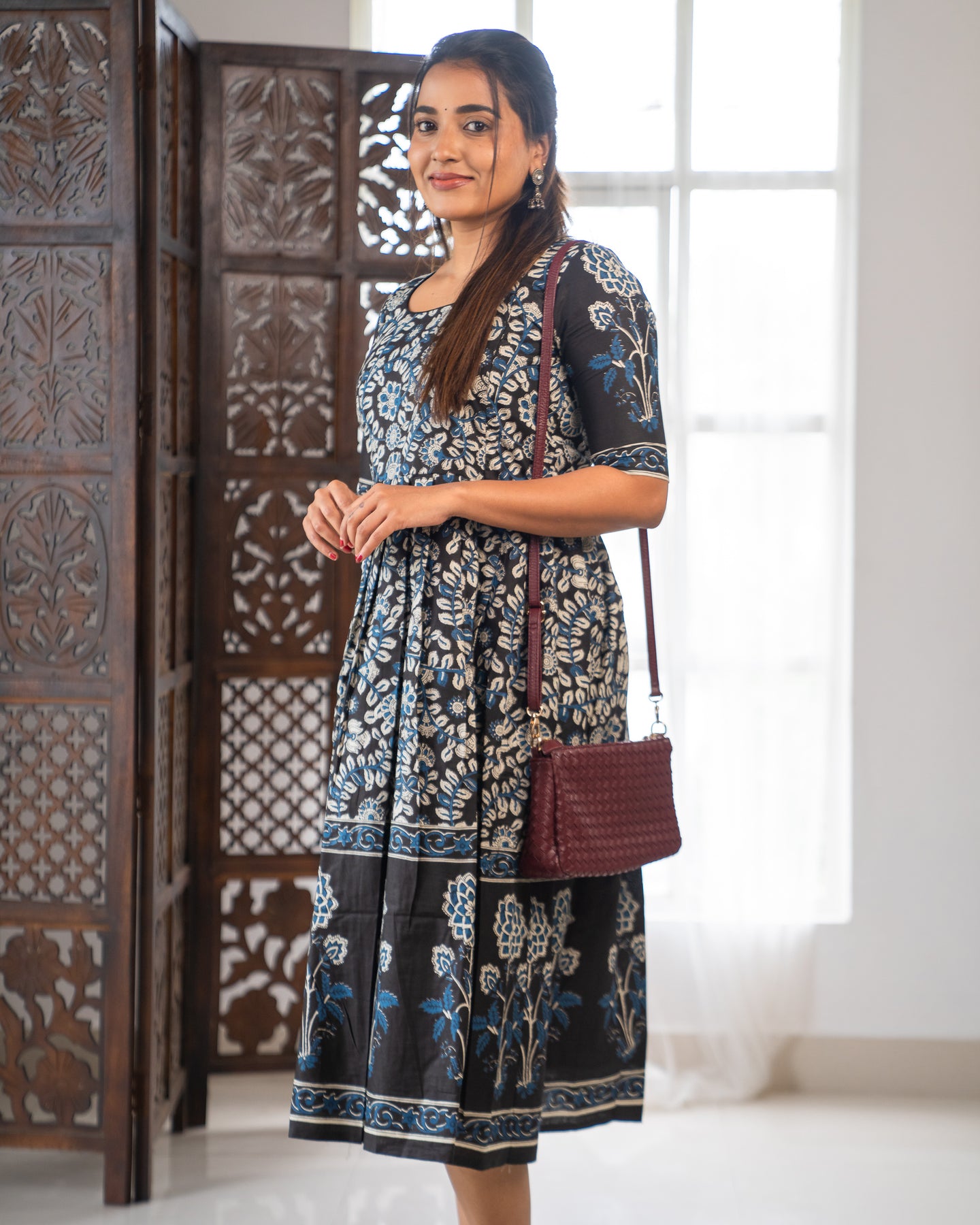 The stunning black prints, adorned with intricate floral prints, make it a perfect choice for everyday wear, casual outings, or workwear. The big border adds a vintage charm, while the fit-and-flare silhouette ensures effortless movement.