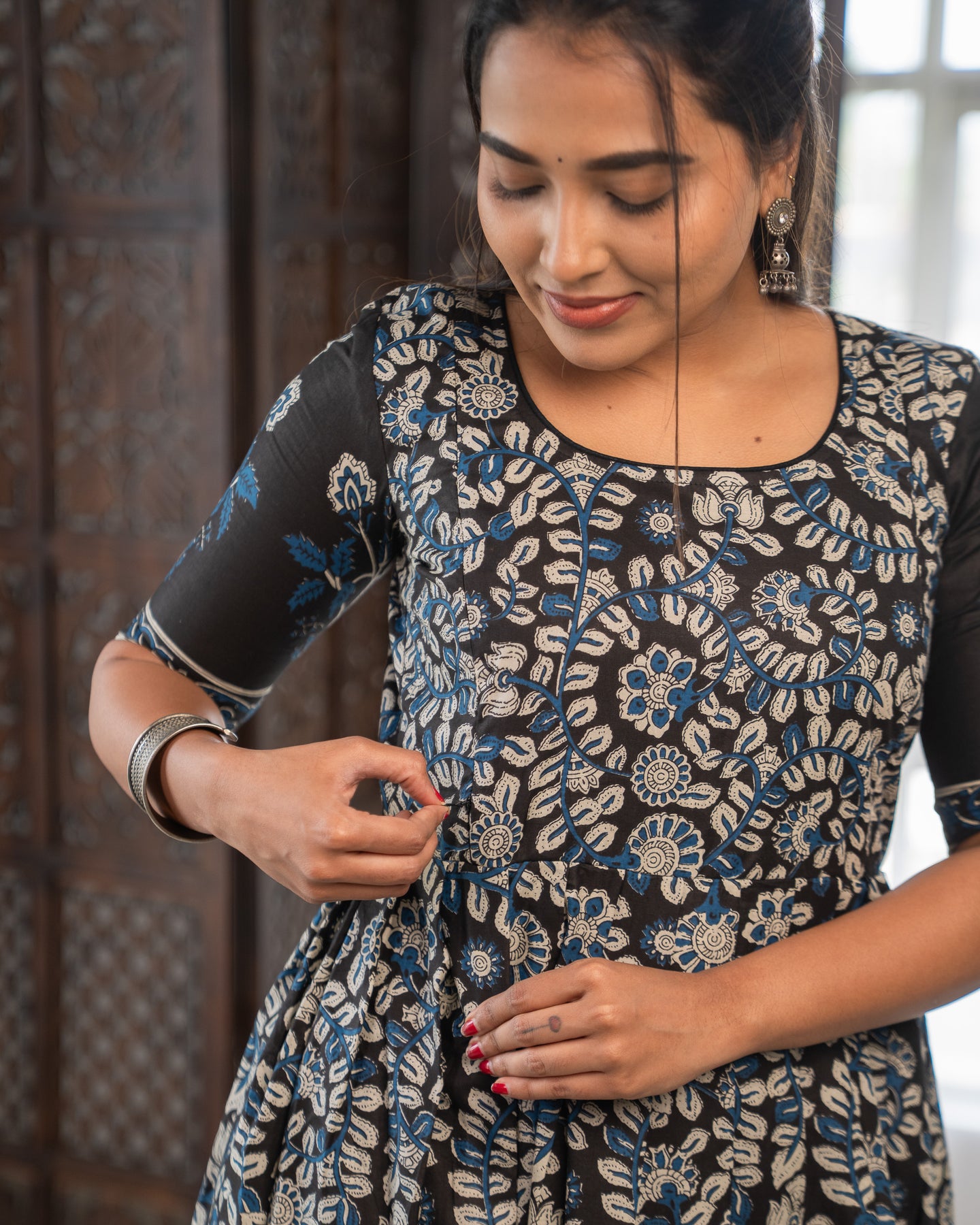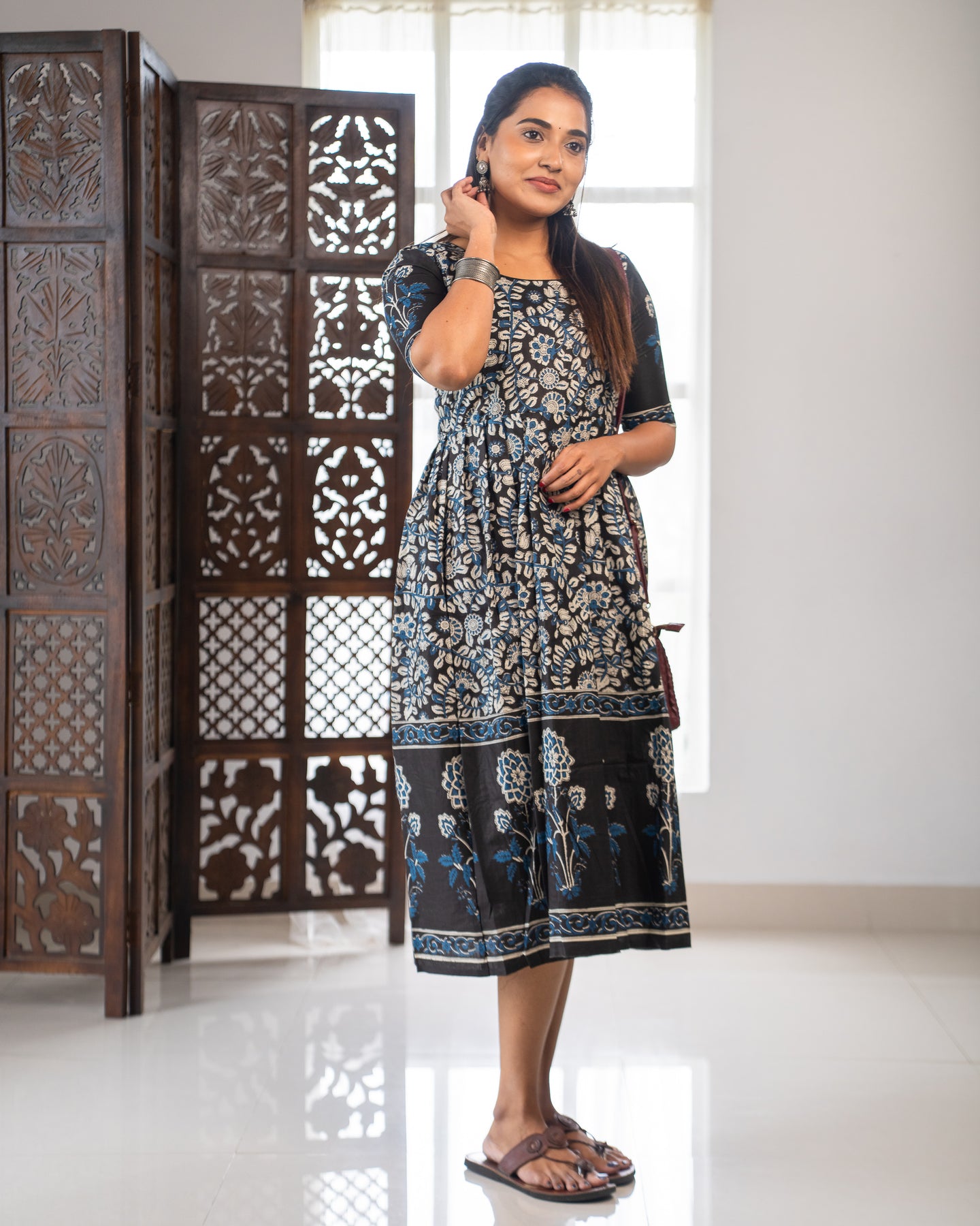 The stunning black prints, adorned with intricate floral prints, make it a perfect choice for everyday wear, casual outings, or workwear. The big border adds a vintage charm, while the fit-and-flare silhouette ensures effortless movement.