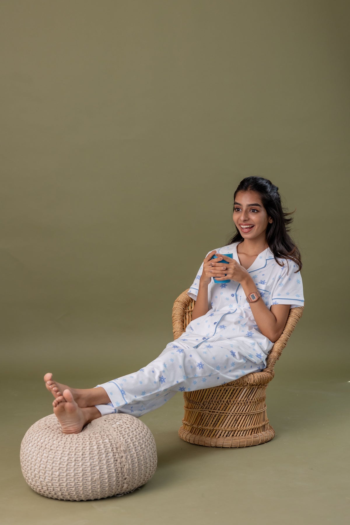 Settle into serene slumber with these delightful Winter White Snowflake Pyjamas that capture the essence of a crisp winter's night. A pristine white foundation is beautifully adorned with an all-over blue star pattern, evoking that refreshing frozen aesthetic you'll love. The revere collar top is elegantly trimmed with soft blue piping for a sophisticated finish, complete with a practical front pocket. Coordinating pants offer dual pockets for convenience and feature matching blue cuff piping that perfectly complements the top. Wrap yourself in cozy elegance and embrace the peaceful magic of winter evenings.